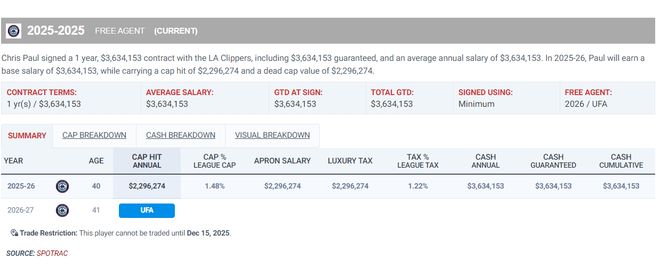 保罗今夏是以一年229万的老将底薪重返快船,快船得到40岁的他赚翻了。